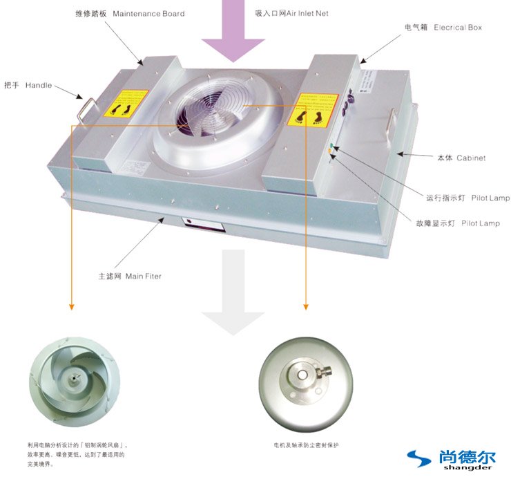 風機過濾單元(yuán)( Fan Filter Units),簡稱FFU。是一種自帶動力具有過(guò)濾功能的末端送風裝置;風機(jī)從頂部將空氣吸入並經HEPA過濾,過濾後將潔淨空氣從出風(fēng)麵均(jun1)勻(yún)送出,為潔淨環境提供潔淨空氣(qì)和微粒過濾(lǜ)控製。